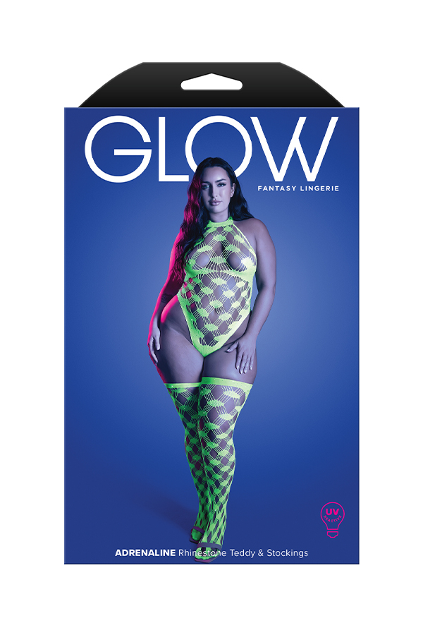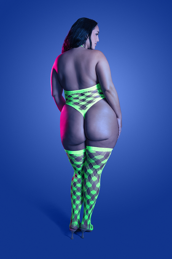 Halter teddy and stockings in geometric rhinestone diamond fishnet