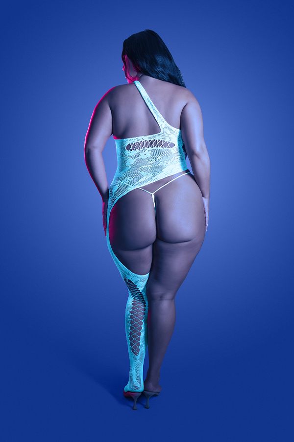 Floral knit asymmetrical bodystocking and panty; glows blue